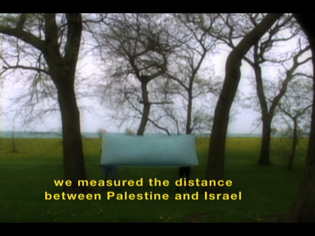 “Fotogramas fijos largos, texto, lenguaje y sonido se entrelazan para desplegar la narrativa de un grupo anónimo que ocupa su tiempo midiendo la distancia. Transición de medidas inocentes en políticas que examinan cómo la imagen y el sonido comunican la historia. Explora un absoluto desencanto con los hechos cuando lo visual falla en comunicar lo trágico” (Basma Alsharif).